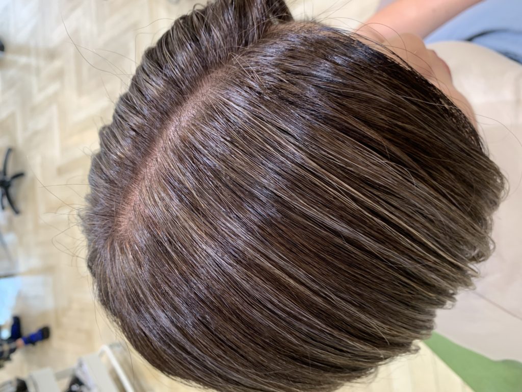 根元の白髪と馴染むような細いハイライトをいれることで 生えてきた白髪が気にならないようにして 白髪染めを卒業していこう! という施術です。
